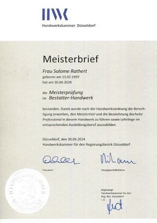 Ihre persönlichen Wünsche für die Bestattung stehen für uns jederzeit im Mittelpunkt. Um Sie bestmöglich zu unterstützen, verlassen wir uns nicht allein auf Erfahrung und Einfühlungsvermögen, wir legen auch großen Wert auf bestmögliche fachliche Qualifikation: Christian Rathert ist Tischlermeister und Fachgeprüfter Bestatter. Salome Rathert ist Tischlerin, Bestattungsfachkraft und seit 2024 auch Bestattermeisterin. Bereits seit 1989 erfüllen wir alle Qualitätsstandards, um das Markenzeichen des Bundesverbands Deutscher Bestatter zu führen, sind inzwischen auch vom ZDHZert nach DIN EN 15017, der europäischen Norm für Bestattungsdienstleistungen, zertifiziert. Kerstin Altvater-Rathert bereichert unsere Bestattungen als Gärtnerin und Floristin mit feinem Gespür für besondere Trauerfeierdekorationen.